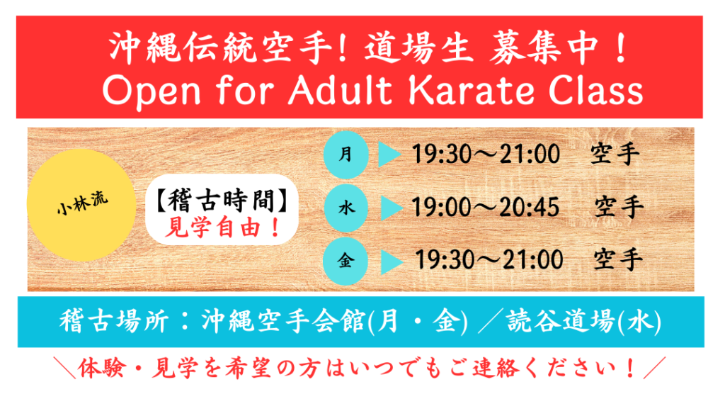 | 稽古日 | 月、金 19:30~21:00 空手会館 水、19:00~20:45 読谷道場 |
